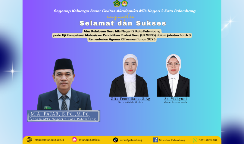 MTsN 2 Palembang kembali menorehkan prestasi membanggakan melalui keberhasilan gurunya yang resmi dinyatakan lulus Uji Kompetensi Mahasiswa Pendidikan Profesi Guru (UKMPPG) Dalam Jabatan Batch 3 Formasi Tahun 2025 yang diselenggarakan Kementerian Agama Republik Indonesia. Kelulusan ini menjadi bukti nyata komitmen tenaga pendidik MTsN 2 Palembang dalam meningkatkan kualitas diri dan profesionalisme di bidang pendidikan, Senin (17/11/25).
