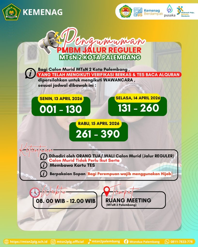 Bagi Calon Murid Baru MTsN 2 Palembang yang telah mengikuti verifikasi berkas dan tes Tahfidz, dipersilahkan untuk Orang Tua/Wali Siswa mengikuti WAWANCARA dengan JADWAL berikut :